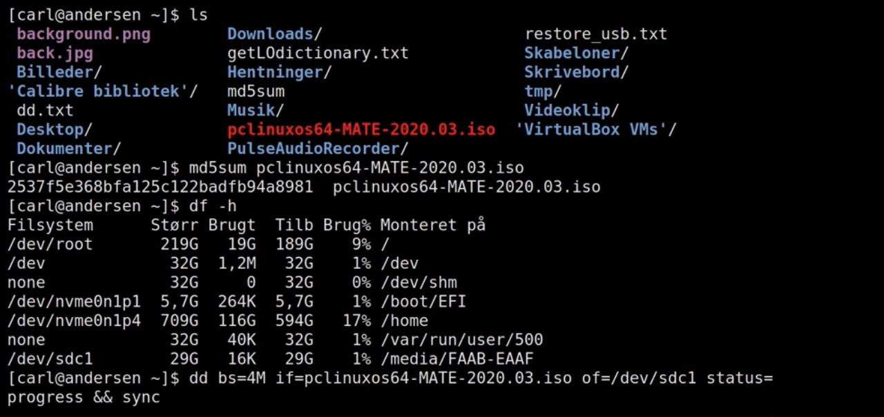 - dd bs=4M if=pclinuxos64-MATE-2020.03.iso of=/dev/sdc1 status=progress && sync