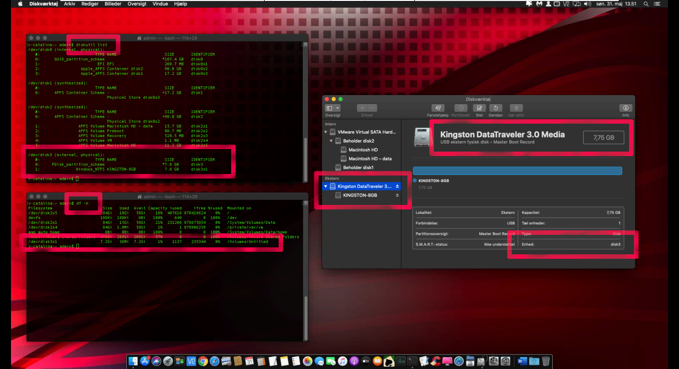 DD kommandoen på macOSdf -h virker på macOS, men de fleste vil nok foretrække terminal programmet diskutil list, der også har et GUI værktøj (Diskværktøj). Begge billeder viser værktøjerne.