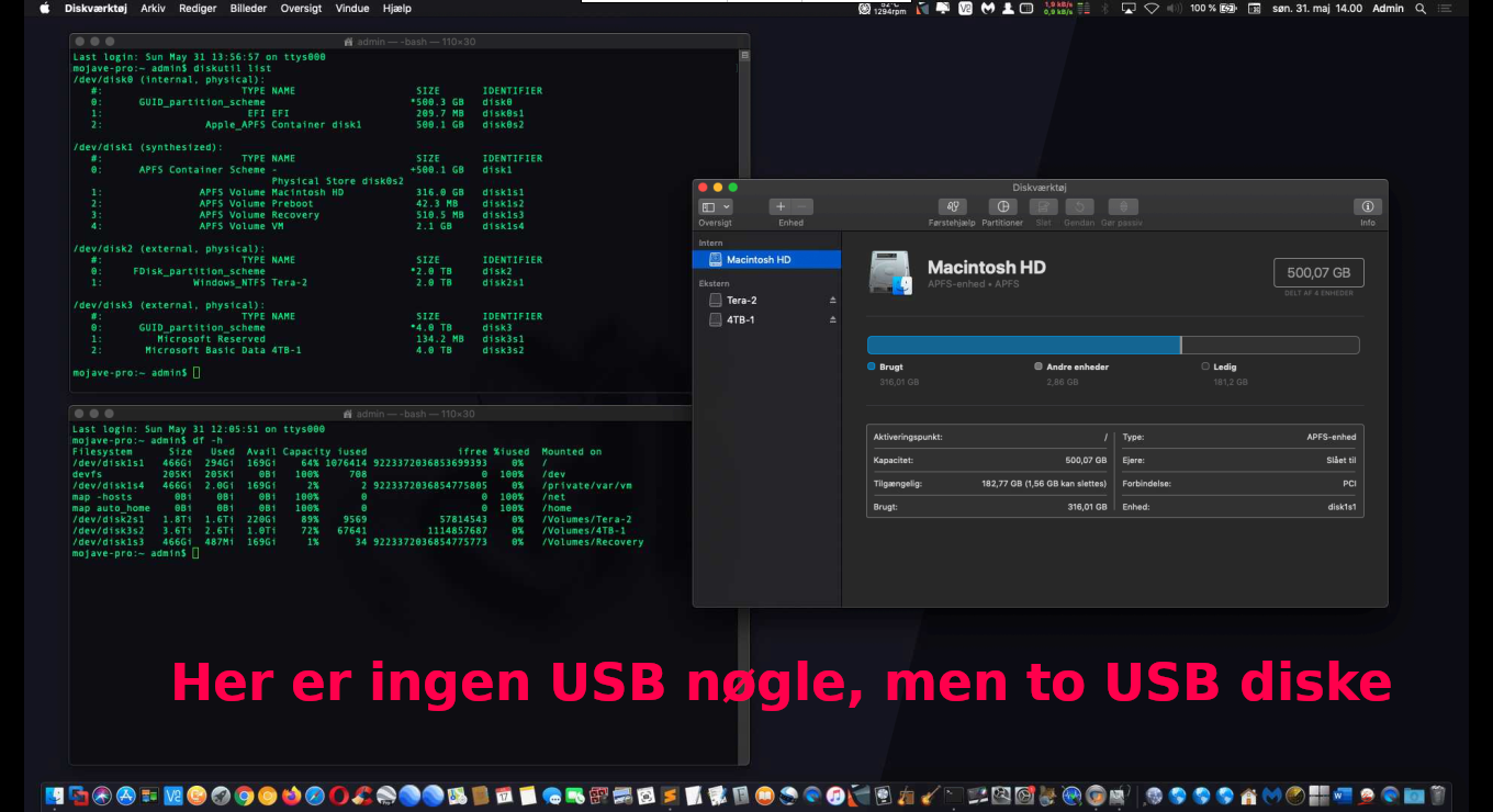 Her et med macOS Mojave uden USB Nøgle, men med to USB harddiske. Disse to USB diske, vil man ikke have slettet, fordi man vil oprette en bootable USB nøgle. Derfor er det klogt at slukke maskinen, og fjerne dem fra USB portene, før man begynder.