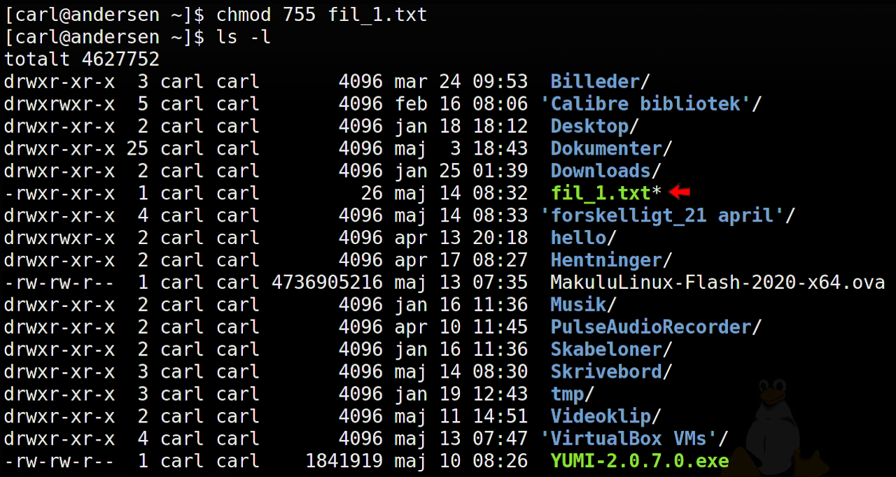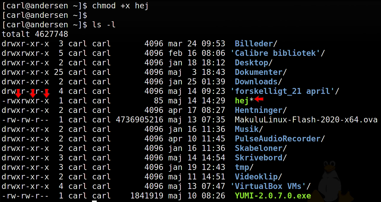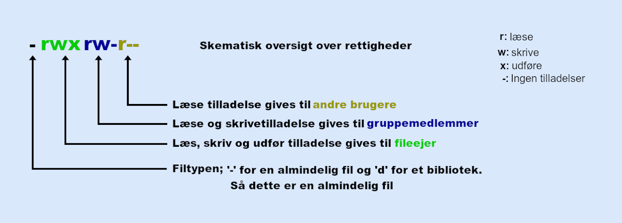 - rwx : Dette er den tilladelse, der giver brugeren mulighed for at læse, skrive samt udføre programmet. Udførelse af tilladelse gælder kun, hvis filen er et program.