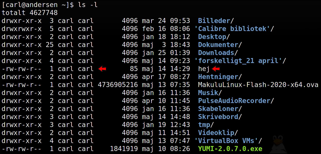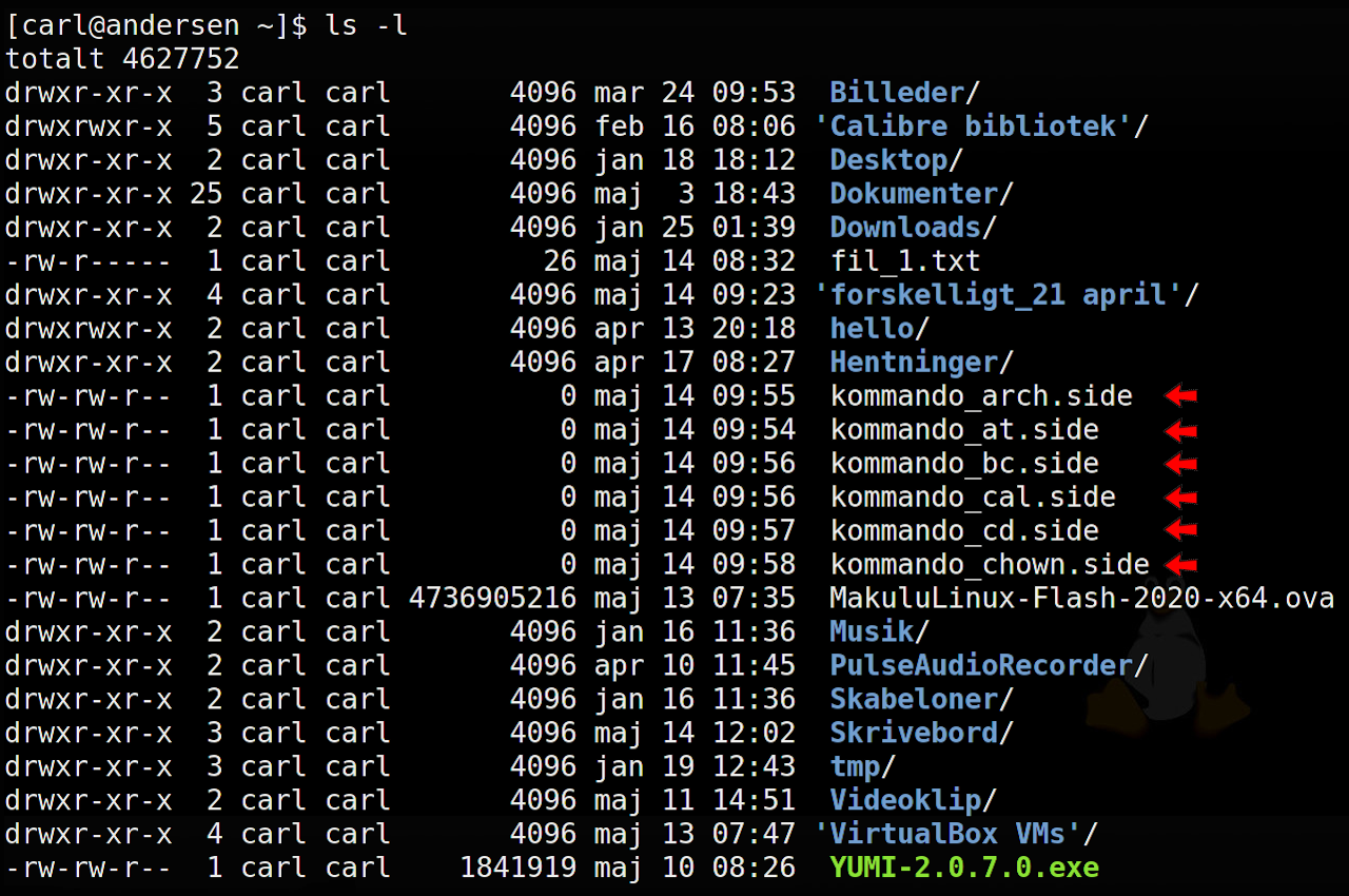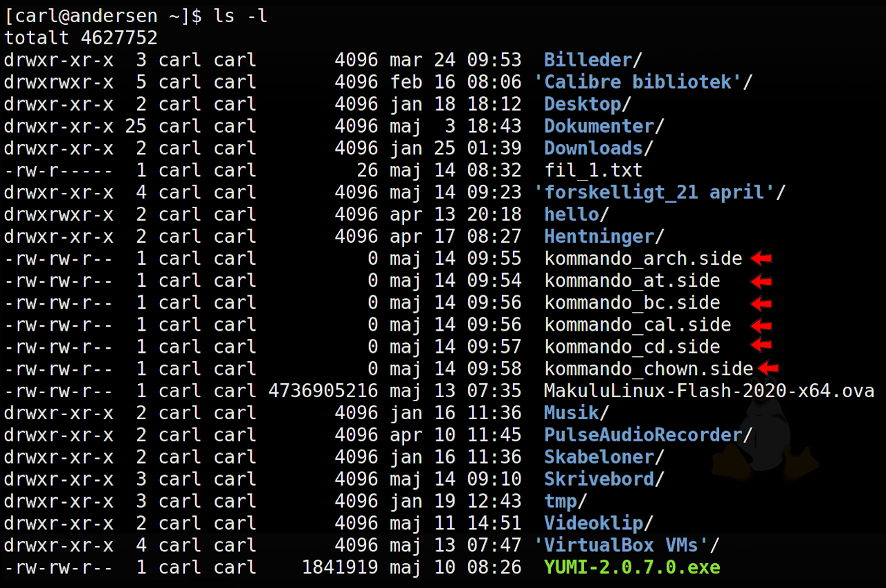 Hvis du har rodet rundt med tilladelser på filer og mapper i dit hjemmebibliotek, og ikke kan åbne mapper og filer, så er der mulighed for at rode dig ud af det. cd hen til hvor du har dine mapper og filer, i det her tilfælde Dokumenter, og udfør følgende kommandoer.