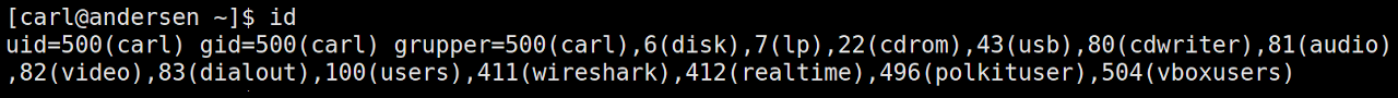 Du skal vide, hvad dit brugernavn er. Hvis du ikke gør det, kan det vises ved hjælp af id-kommandoen, som også viser den standardgruppe, du tilhører, og til sidst andre grupper, som du er medlem af