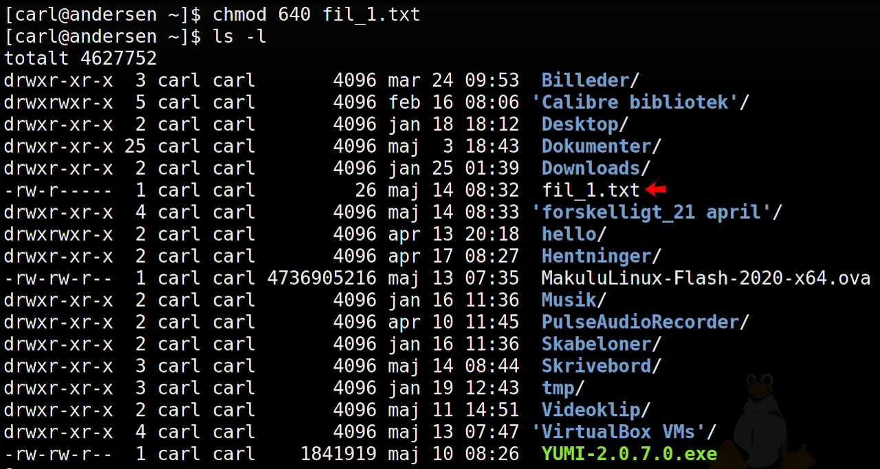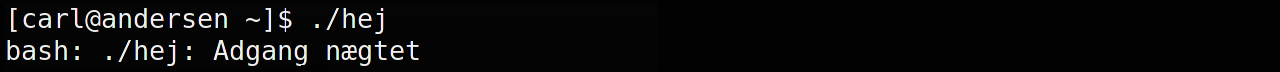 | chmod 660 fil | Brugere, der tilhører din gruppe, kan ændre denne fil, andre har overhovedet ikke adgang til den. |