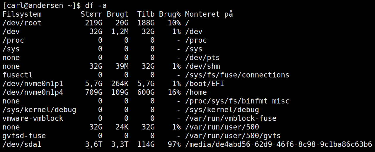- -a, --all - medtag pseudo- dobbelte samt utilgængelige filsystemer