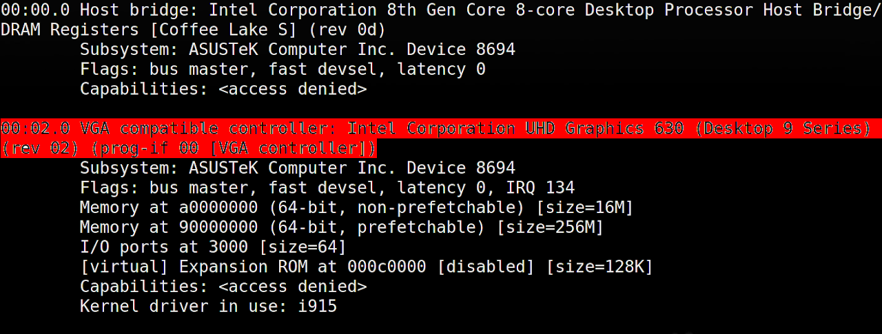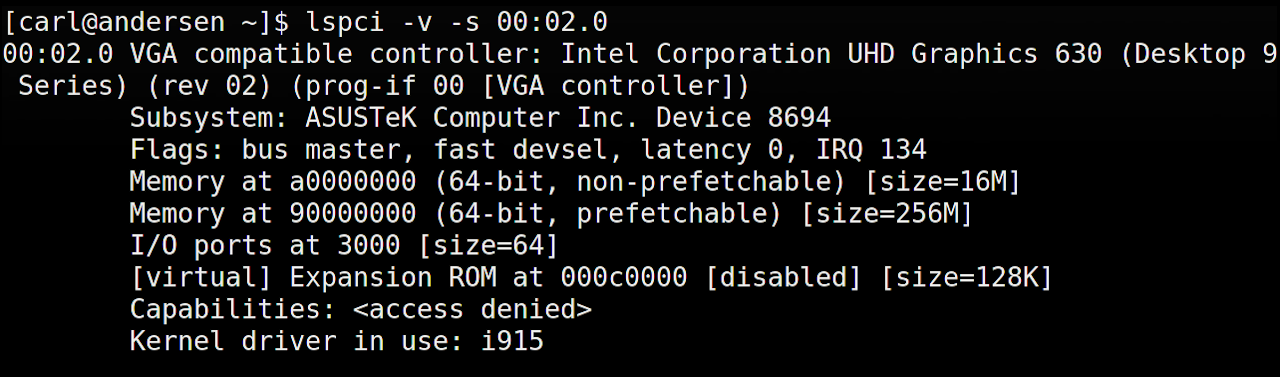 Ovenstående output viser, at det er et "PRIME B360M-C" som er et ASUS bundkort. Google på den model for at finde produktspecifikationsdokumentet og se efter video / grafikoplysninger i det.
