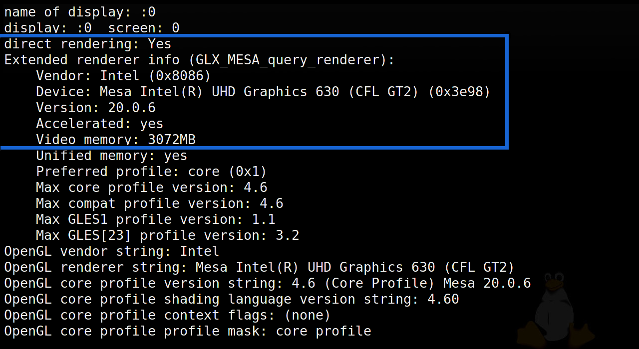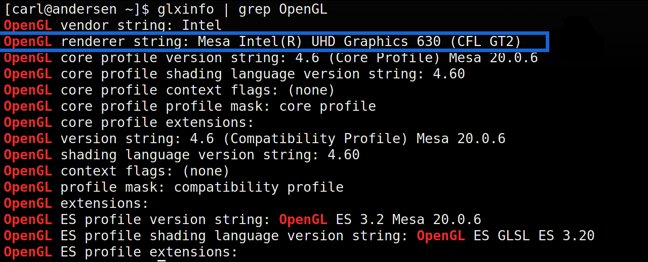 Kontroller glxinfo-kommandoutput for OpenGL-detaljer med følgende kommando.