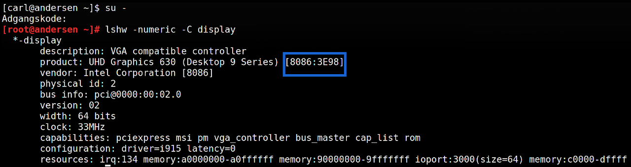 For at lave et output om dit grafikkort, bruger vi flaget -C og videregiver modifikatoren "display" med flaget -numeric tvinger lshw til at angive enhedernes numeriske ID'er samt deres navne.
