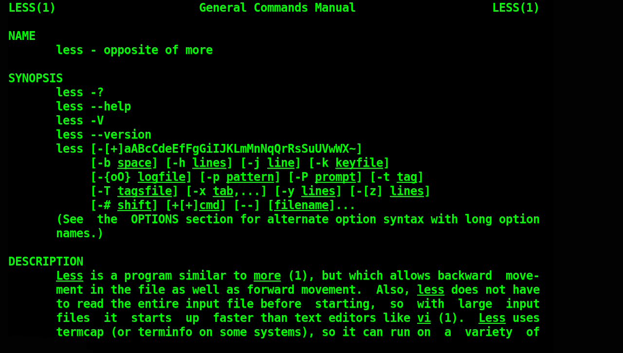 Hvis du ønsker at se alle muligheder med less, så skriv man less i terminalen