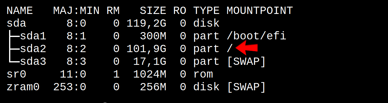 De kan du filnde ud af hvad din root partition er, ved at køre kommandoen lsblk i en terminal.